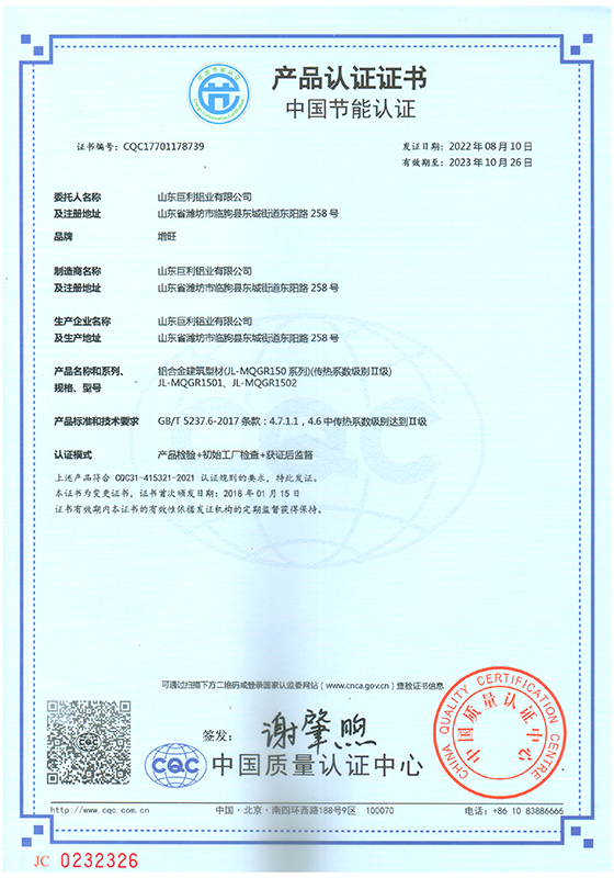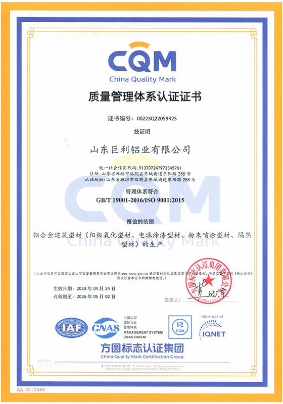 山東巨利鋁業(yè)有限公司是大型專業(yè)化鋁合金門窗、幕墻建筑型材生產(chǎn)企業(yè)。公司座落于中國江北最大鋁合金建筑型材生產(chǎn)、銷售集散地,被稱為“中國鋁業(yè)之都”的臨朐,地處山東半島中部,濰坊市西南部,沂山北麓,公司西臨彌河,東靠長深高速,北接濟(jì)青高速,地理位置優(yōu)越,交通十分便利。公司占地總面積18.5萬平方米,擁有國際先進(jìn)水平的擠壓、陽極氧化、電泳涂漆、粉末噴涂、氟碳噴涂、木紋轉(zhuǎn)印、隔熱斷橋等系列生產(chǎn)線,年生產(chǎn)節(jié)能環(huán)保鋁型材7萬噸。公司先后通過IS09001質(zhì)量管理體系認(rèn)證、ISO14001環(huán)境管理體系認(rèn)證、0HSAS45001職業(yè)健康安全管理體系認(rèn)證、IATF16949汽車行業(yè)質(zhì)量管理體系認(rèn)證和中國綠色建材產(chǎn)品認(rèn)證。公司先后榮獲山東省專精特新中小企業(yè)、山東省高新技術(shù)企業(yè)、山東省科技型中小企業(yè)榮譽(yù)稱號(hào)。“客戶的滿意,巨利的追求”。不斷的改進(jìn)和完善質(zhì)量管理,不斷的提高售后服務(wù)水平,持續(xù)向客戶提供一流的產(chǎn)品和一流的服務(wù),是我們巨利人孜孜以求的永恒目標(biāo),我們?cè)概c廣大業(yè)務(wù)同仁共同努力,共創(chuàng)雙贏,不斷發(fā)展,走向更加輝煌的明天。